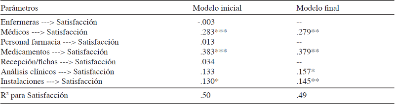 Para el modelo estructural final se fueron eliminando variables latentes independientes no significativas de forma paulatina comenzando por la del peso de regresión más bajo. Al final una variable latente independiente que no había sido significativa en el modelo inicial resultó significativa en el modelo final. De tal forma se obtiene un modelo final depurado (más parsimonioso) sin pesos de regresión no significativos con cuatro variables latentes independientes significativas: servicio del médico, entrega de medicamentos, análisis clínicos y calidad de las instalaciones. El atributo entrega de medicamentos otra vez con el peso de regresión más alto. En la Tabla 9 se puede ver un comparativo entre los coeficientes de determinación y los coeficientes de regresión (parámetros o estimadores) de todos los análisis realizados.