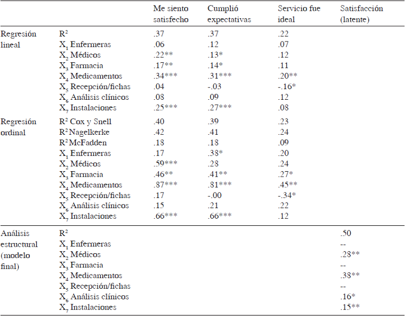 En los resultados de este estudio se dieron dos contradicciones entre los dos tipos de análisis que se realizaron (regresión versus estructural). Una de las contradicciones consiste en qué la variable “atención del personal de farmacia” salió significativa en dos de los tres modelos de regresión, pero no en ninguno de los dos modelos estructurales. La otra incongruencia consiste en que la variable “servicio del personal de análisis clínicos” no resultó significativa en ninguno de los modelos de regresión, pero sí en ambos modelos estructurales. Considerando que el análisis de ecuaciones estructurales en general es un método estadístico multivariado mucho más robusto que el análisis de regresión, aquí se determinó aceptar primordialmente los resultados del primero. De cualquier forma, siempre es interesante ver como en algunas ocasiones los resultados de dos métodos estadísticos distintos no necesariamente coinciden ayudando a incrementar las posibles interpretaciones.
