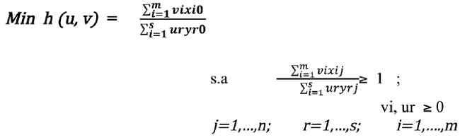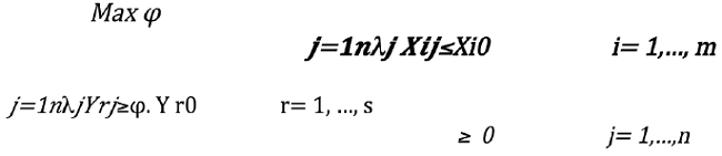 Orientación output: La representación matemática del modelo de acuerdo supone una muestra de unidades de decisión de medida (DMUs) tales que cada DMUj (j=1,2,3…n) produce s outputs Yrj (r= 1,2,3…s) utilizando m inputs X ij (i=1,2,3…m). El modelo DEA-RCE output orientado expresado en forma fraccional se formula mediante las ecuaciones siguientes: