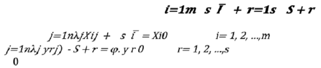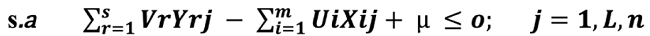 Donde s ī representa el exceso de input i y s+r la carencia de output r. Por lo que el modelo dual (de maximización del output) es la siguiente expresión.