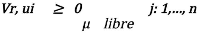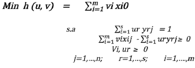 El programa lineal selecciona las ponderaciones que minimizan el input virtual de la unidad evaluada (Vi Xi0) condicionadas a que su output virtual (ur yro) sea igual a la unidad, así como que la aplicación de dichas ponderaciones al resto de unidades de decisión evaluadas no permita que su output virtual exceda del input virtual. La unidad será eficiente si su input virtual es la unidad. En la práctica, el cálculo de los índices de eficiencia es más sencillo si se utiliza la forma dual del modelo anterior, a través de la cual se construye una aproximación lineal por tramos a la verdadera frontera. La formulación dual es la siguiente: