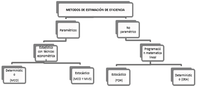 Cuantificación de la eficiencia. “Metodológicamente, para obtener una medida de eficiencia es necesario conocer la función de producción o bien el conjunto de datos de producción aplicado, así como la frontera eficiente” (Guzman, 2005, p. 5). La aproximación cuantitativa que se muestra desde el trabajo de Farrel, se trata de un concepto relativo y no absoluto (Fernández & Flores, 2005, p. 3). La propuesta que sugiere Farrell es recurrir al uso de cónicas ó poligonales convexas para construir las isocuantas o fronteras en forma no paramétrica, y sólo partiendo de la información disponible acerca del comportamiento de numerosas unidades de decisión de medida (DMUs) comparables, muchas de las cuales serán más eficientes que otras (Schuschny, 2007, p. 45). Sus dos grandes aportaciones, son basadas en la separación de la eficiencia en dos componentes: La eficiencia técnica, que se refiere a la habilidad de obtener el máximo nivel de producción dado la menor combinación de insumos, bajo el supuesto de rendimientos constantes a escala (RCE) (Arzubi & Berbel, 2002). Esta puede ser medida en términos de relaciones físicas entre output observable y el máximo output obtenible (Herrera & Francke, 2007, p. 5). Y la segunda aportación es la de La eficiencia asignativa, que supone lograr el costo mínimo de producción de una cantidad determinada de producción al cambiar las relaciones proporcionales de los insumos utilizados en función de sus precios y productividades marginales (Romeu & Rodríguez, 2008, p. 6). Ambas medidas muestran la eficiencia económica (Arzubi & Berbel, 2002, p. 106). Con estas dos posibilidades se fueron desarrollando dos formas de estimar la frontera de referencia: Estos dos grupos son aquellos que consideran una función de producción tipo frontera y los de tipo no frontera.
