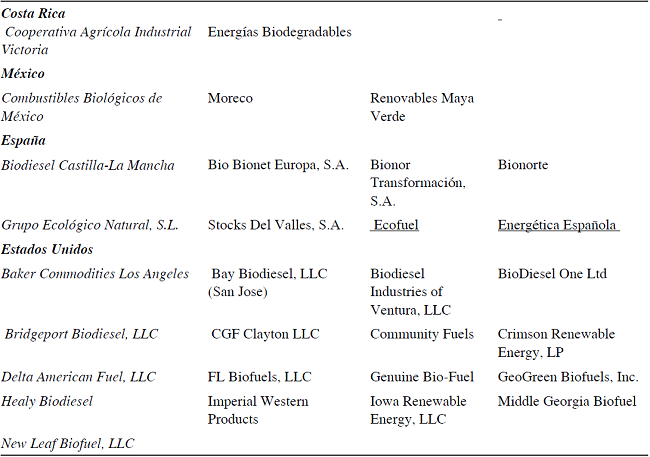 La empresa Renovables Maya Verde de México, Imperial Western Products que tiene planta en California y Arizona, y Middle Georgia Biofuel de Georgia son las empresas que mejor se posicionan cómo más eficientes y pueden retomarse como modelo de refencia.