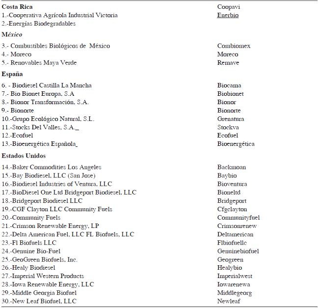 Delimitación temporal, espacial y sectorial de la muestra. El presente estudio analiza la situación de 30 empresas productoras de biodiesel a partir de aceites vegetales y grasas animales de desecho en el año 2014, de 4 países: Costa Rica, Estados Unidos, España y México. Mismas que mostraron disponibilidad para proporcionar datos mediante encuesta o bases de datos popias y/o de las asociaciones. Las cuales son mostradas en la siguiente tabla.