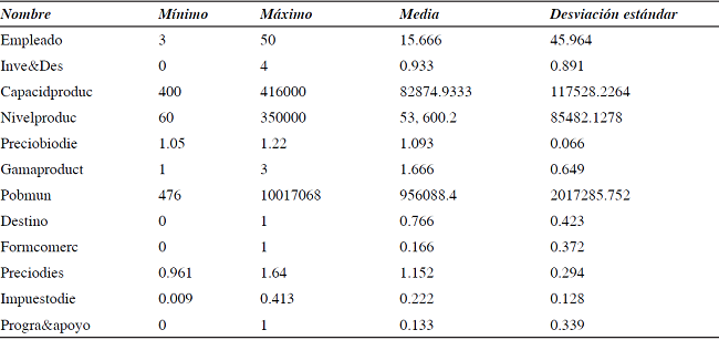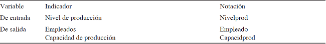 Especificación de las variables utilizadas. Se tomaron en cuenta: Variables de entrada: Empleados: que son las personas necesarias para el proceso de producción, y; Capacidad de producción: que es la capacidad máxima de producción de la planta; Variables de salida: Litros de biodiesel: que incluye la cantidad producida en el año anterior. Para la equiparación de la unidad de medida (litros y toneladas), una condición necesaria, se tomó en cuenta que la densidad del diesel es de 0.88 g/cm3.
