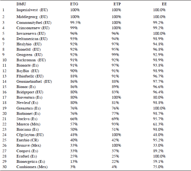 Dados los resultados anteriores, se procedio a evaluar cada una de las variables establecidas anteriormente para el modelo DEA, mediante el modelo de RVE. Así los resultados del análisis de eficiencia incorporando únicamente variables de escala, se puede encontrar una empresa mexicana “Renovables Maya Verde”. Las empresas estdounidenses “Biodiesel Industries of Ventura LLC, Community Fuels, Crimson Renewable Energy, LP, Imperial Western Products, CGF Clayton LLC, Iowa Renewable Energy, LLC y, Middle Georgia Biofuel”. Siendo las cuatro primeras del Estado de California, mientras que las últimas tres de Delaware, Iowa y Georgia respectivamente. También se muestran empresas con alto nivel de eficiencia, con niveles cercanos a la unidad. En el caso de las empresas estadounidenses, se muestra que todas las restantes son cercanas al nivel de eficiencia. Para el caso de México, la empresa michoacana “Moreco” también se encuentra en un alto nivel de eficiencia. Y en el caso de España las empresas “Bionor Transformación y Bionorte” de Álava y Asturias respectivamente son las empresas con alto nivel de eficiencia. Las empresas con bajos niveles de eficiencia son: Cooperativa Agrícola Industrial Victoria, de Alejuela Costa Rica, Cambiomex, empresa mexicana situada en Villa Hermosa Tabasco, Bioenergética Española que es una empresa establecida en Zaragoza, además de Ecofuel del mismo país. Los principales Slacks mostraron el desaprovechamiento de las variables de entrada que permiten obtener niveles superiores de producción. Las principales fueron: Cooperativa Agrícola Industrial Victoria de Ajuela, con un exceso de más de cuatro empleados. Mientras que Stocks Del Valles, S.A. de 36 empleados. En la empresa española “Bioenergética Española”, se da un exceso o desperdicio en la capacidad productiva de 22 800 toneladas anuales.