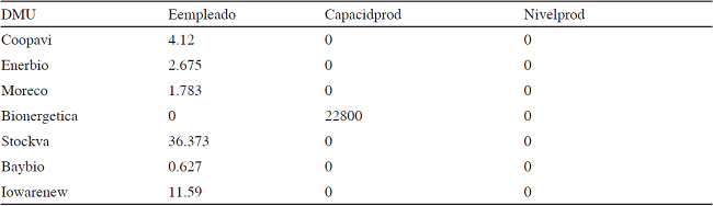 Las improvements mostraron mejoras para el caso de de Stock del Valle realizar grandes reducciones en cuanto al número de empleados que debe de incluir teniendo cerca de 45 a un nivel recomendado de ocho. Y en el caso de Iowa se recomienda reducir en casi 12 empleados, Iowa Renewable Energy, LLC debe de hacerlo en casi doce empleados, mientras que Cooperativa Agrícola Industrial Victoria casi lo hace por mitad, pasando de 10 a 5.88. En cuanto al nivel de producción, también se muestra posibilidad de incrementarlo en la mayoría de las empresas, mediante el aprovechamiento de la capacidad instalada (véase tabla 8).