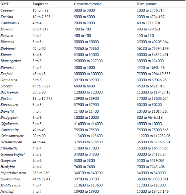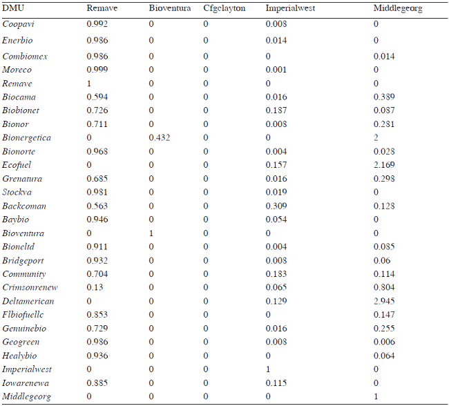 Las empresas que pueden incrementar la producción en un nivel mediano son Stocks Del Valles, S.A. en un 44.9%, Grupo Ecológico Natural, S.L. en un 30%, Bridgeport Biodiesel, LLC puede hacerlo en 20.6 % y, New Leaf Biofuel, LLC en un 22.84%. Las Lambdas permitieron identificar el grado de benchmarking que debe realizar cada una de las empresas. La empresa Renovables Maya Verde de México, Imperial Western Products que tiene planta en California y Arizona, y Middle Georgia Biofuel de Georgia son las empresas que mejor se catalogan como empresas que pueden ser retomadas para elevar el nivel de eficiencia.
