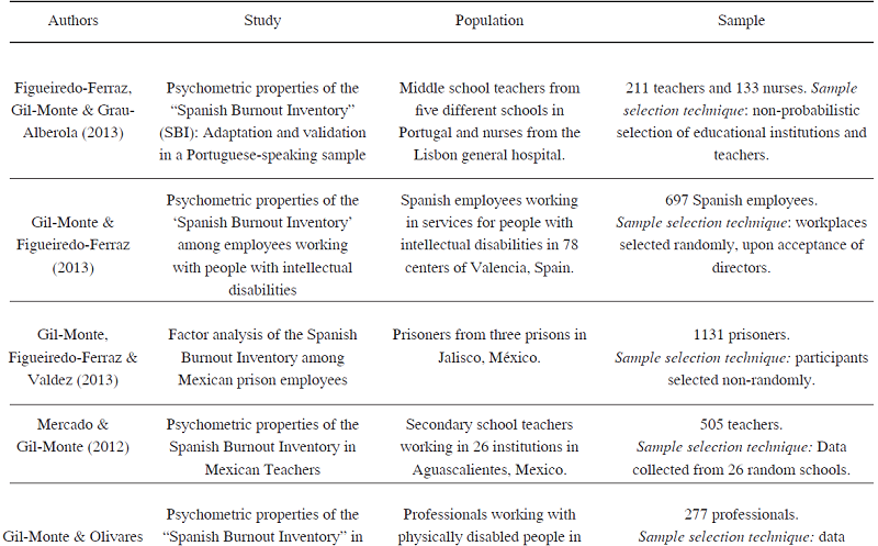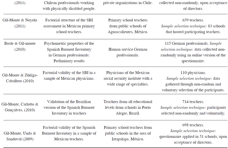 On the other hand, we emphasize the importance of continuous evaluations of the Burnout syndrome, taking advantage of instruments that have been validated in Latin American contexts, such as the SBI, since presently and under current working conditions it is possible to find situations that may increase the prevalence of Burnout, for example, aspects related to psychological exhaustion. The 83.33% (n = 10) of the studies reviewed in this research met this sample condition.