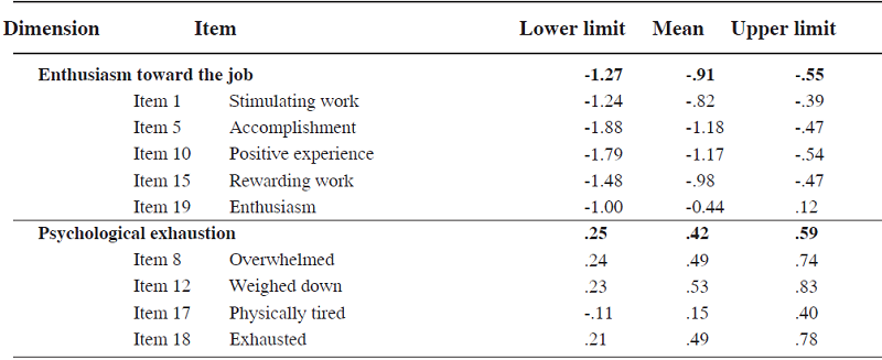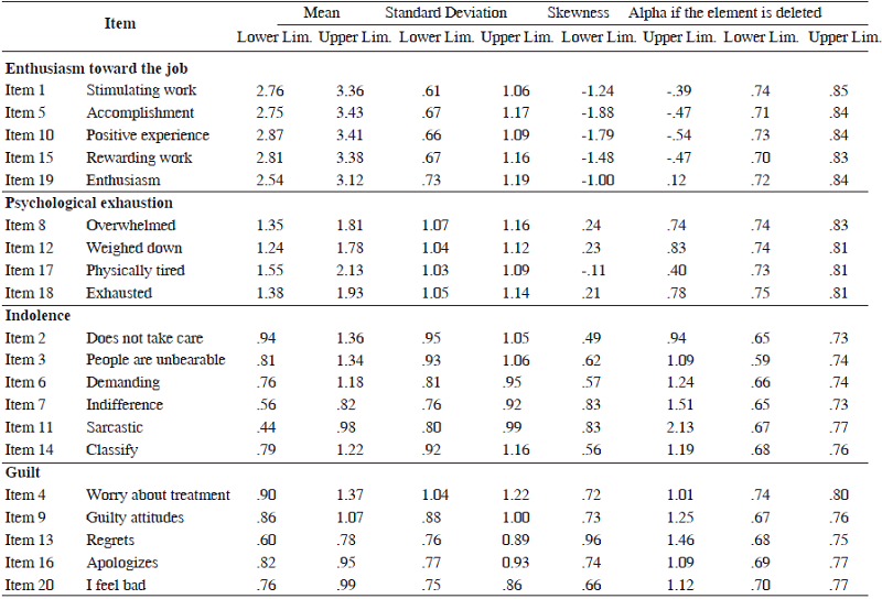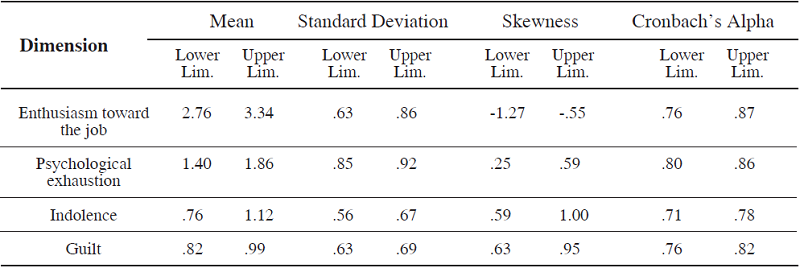 Furthermore, when analyzing the indicators of the aggregated scales (Enthusiasm toward the job, Psychological exhaustion, Indolence, and Guilt), the analysis of the attributes made evident that the dimension that generated prevalence of Burnout was Psychological exhaustion, whereas it was not prevalent with the dimensions of Indolence and Guilt. One aspect of note at the aggregated level was the significant decrease in the levels of skewness, which was due to the fact that under the scale transformation process they tend toward a normal distribution, therefore, managing to correct the skewness problems in each attribute. Nevertheless, it is noteworthy that Enthusiasm toward the job, under a confidence interval of 95%, had a negative skewness of more than 1.0 (A≥1.0), leaving in doubt the nonexistence of asymmetry in this dimension (Table 4).