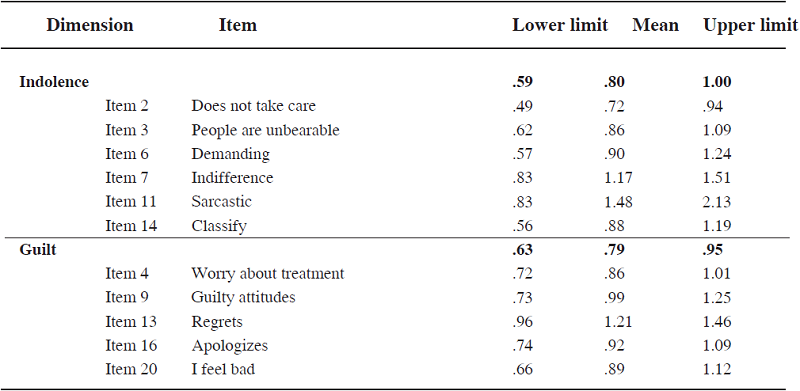 On the other hand, when evaluating the general attributes of the remaining dimensions, low values are identified, but the attributes of the Psychological Exhaustion subscale present a higher level of negative valuation, and for this reason it could be thought that the subscale would be the first conditioner to generate prevalence of Burnout (Table 2). The Indolence and Guilt subscales have a low prevalence level with a confidence interval of 95%, the weighting of these attributes vary between .44 and 1.36 [0.44, 1.36], which allows recognizing that these are not determining factors for the syndrome in the study contexts (Table 2).