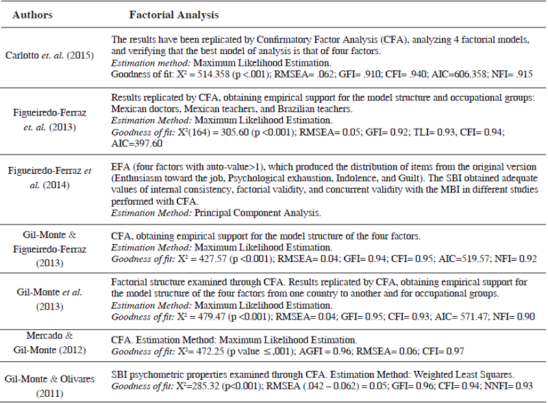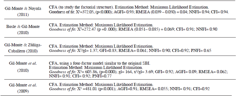 It is worth mentioning that in the ten studies that performed CFA, goodness-of-fit conditions of the models such as GFI ≥ .90, RMSEA ≤. 08, and CFI ≥ .90 are present. However, in each of these we identified a significant X2 (p-value ≤ .05), which shows that each of these models allows a good estimate and conceptual understanding from the studied sample, but do not allow generalization. The Spanish Burnout Inventory (SBI) remains a nongeneralized conceptual model in the study contexts (Table 5) (Bagozzi & Yi, 1988; Bollen & Long, 1993). Nonetheless, both the chi-square test and the RMSEA are sensitive to the sample size.