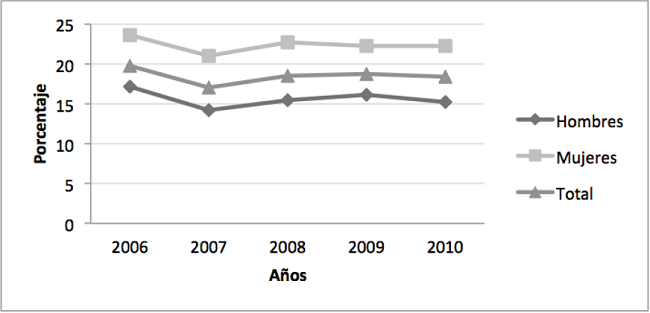 En la figura 1 se estudia la evolución de la sobrecualificación en España en el período 2006-2010 en función del género. Vemos que la sobrecualificación es mayor en las mujeres que en los hombres en todos los años. En el año anterior al inicio de la crisis (2007) se observa una bajada de la sobrecualificación total entorno al 2-3% si la comparamos con el año 2006, cifras que volverán a subir en el año siguiente con el inicio de la crisis. De los años posteriores, 2009 es el que presenta mayores cifras de sobrecualificación, excepto en las mujeres. No podemos avanzar en este estudio en años posteriores porque la Encuesta calidad de vida en el trabajo acaba en 2010.