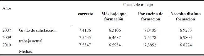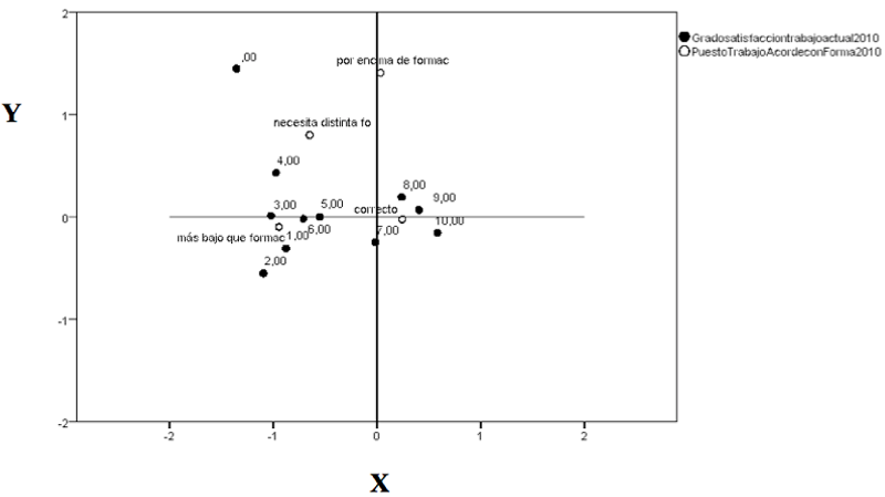 Ala vista de la situación de las categorías sobre el plano, se observa que la sobrecualificación (puesto de trabajo más bajo que la formación) se asocia a los grados de satisfacción 1, 2 y 3, mientras que cuando el puesto de trabajo es el adecuado a la formación del trabajador (correcto), el grado de satisfacción es 7, 8, 9 y 10. Estos resultados confirman lo expuesto previamente en el análisis teórico, como en Tsang (1987).