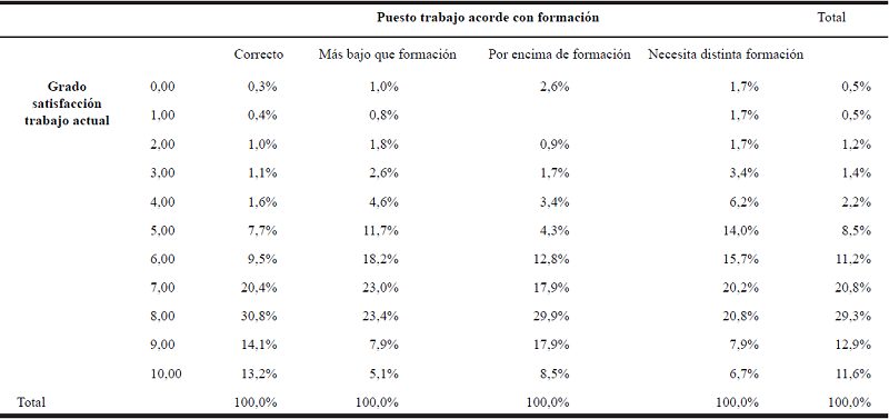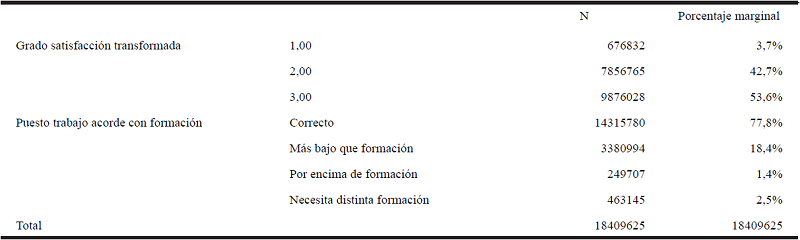 Del contraste de independencia planteado a partir de las variables Grado de satisfacción y el Puesto de trabajo se desprende que ambas variables no son independientes. Esto justifica la utilización, por un lado, de medidas de asociación, y por otro, la aplicación de un análisis de correspondencias. A la vista de la situación de las categorías sobre el plano, se observa que la sobrecualificación se asocia a grados de satisfacción bajos (1, 2 y 3), mientras que si el puesto de trabajo es el adecuado a la formación del trabajador, el grado de satisfacción es alto (7, 8, 9 y 10). Con la variable grado de satisfacción recodificada (1-grado de satisfacción bajo, 2-grado de satisfacción medio y 3-grado de satisfacción alto) aplicamos una regresión logística ordinal, obteniendo muy buenos resultados ya que las probabilidades estimadas reproducen muy bien los porcentajes iniciales de la tabla de contingencia; por ejemplo, la probabilidad estimada de obtener un grado de satisfacción medio en un trabajador sobrecualificado es del 57,85%, siendo el porcentaje obtenido en la tabla de contingencia inicial del 57,5%. Los resultados del análisis empírico los consideramos muy satisfactorios, ya que han confirmado los postulados teóricos del epígrafe 2.