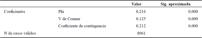 Se realizan pruebas chi-cuadrado, obteniendo un estadístico chi-cuadrado de Pearson con valor 377,477 (p=0,000) y el de razón de verosimilitudes igual a 359,869 (p=0,000) que hacen rechazar la hipótesis nula, por tanto, ambas variables no son independientes. Al no ser independientes, se calculan las medidas de asociación (tabla 2), apropiadas en el caso de tablas de contingencia cuando las variables categóricas son nominales; en este caso, indican asociación escasa al estar los coeficientes próximos a cero.