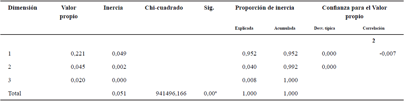 En el análisis de correspondencias siguiente, volvemos a comprobar que las variables no son independientes (véase p=0,000 en tabla 3). La inercia total representa la explicación total de los ejes (explican un total de 0,051). Aunque el valor de la inercia puede parecer pequeño, (0,049, 0,002 y 0,000), entre los tres ejes explican el 100% de la varianza. Observamos que solo la primera dimensión contribuye un 95,2% a dicha inercia y que las dos primeras contribuyen un 99%, por lo que afirmamos que las dependencias observadas en la tabla de contingencia están adecuadamente recogidas por las dos primeras dimensiones.