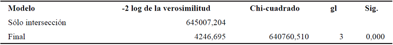 La tabla 5 corresponde a la prueba de ajuste global del modelo. El estadístico chi-cuadrado (p<0,05) indica que el modelo final señala una mejora significativa sobre el modelo de sólo intersección, se rechaza la hipótesis de que el modelo sin la inclusión de la variable explicativa es adecuado. Los pseudo R2 valen lo siguiente: el de Cox y Snell 0,034, el de Nagelkerke 0,042 y el de McFadden 0,021. Aunque estos resultados son de pequeña cuantía, es razonable que por ejemplo solo el 4,2% (Nagelkerke) del grado de satisfacción en el trabajo se explique por la variable puesto de trabajo, ya que influyen muchas más variables que no entraron en este modelo.