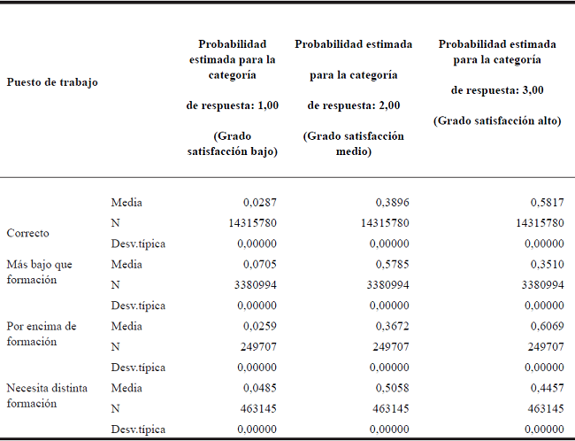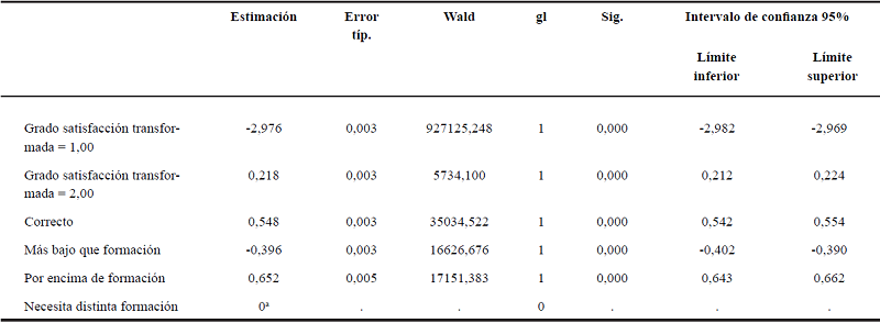 En la tabla 6 aparecen las estimaciones de los parámetros. El número de parámetros es el número de categorías de la variable menos uno. Todos los parámetros son significativos y además, los trabajadores sobrecualificados (puesto de trabajo más bajo que formación) tienen un grado de satisfacción con el trabajo menor que los trabajadores en los que el puesto de trabajo necesita distinta formación (categoría de referencia, al que le corresponde un coeficiente cero). El estadístico de Wald es el cuadrado de la relación entre el parámetro y su error típico. Este mismo procedimiento consistente en la realización de una regresión ordinal a partir de la variable grado de satisfacción transformada puede verse en Sánchez-Sellero et al. (2017).