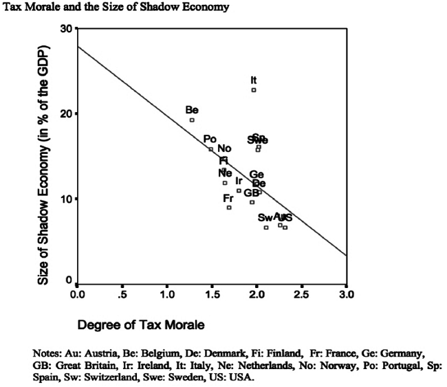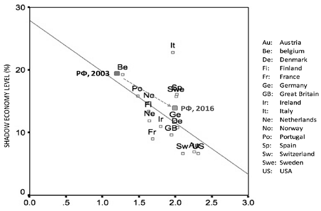 American scientists considering the response to the question “Do you think that tax evasion whenever possible can always be justified or somewhere in between?” assess the level of tax moral, defining “tax moral” as a self-motivation of a person to pay taxes. The survey was conducted on a ten-point scale with a subsequent recoding to 4-pont scale. Graphic interpretation of the dependency model in figure 2 reflects a significant negative data correlation of 16 countries between tax moral and shadow economy level (- 0,567).