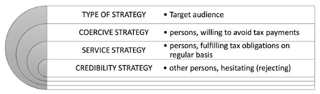 To date, the idea of combination of strategies is not considered an innovation. The principle of flexible regulation is built on a productive combination of conviction and sanctions (Ayres & Braithwaite, 1992), on which the service and credibility strategies are based (Kirchler, Hoelzl & Wahl, 2008; Alm & Torgler, 2011). Each strategy aims at different target audience, which is reflected in figure 3.