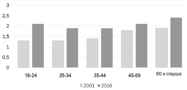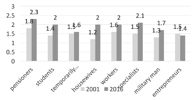 Comparison of estimation respondents’ tax morality by their activity in 2001 - 2016 (figure 6) reflects growth in tax morality level by all categories, except businessmen, having the lowest index of willingness to pay taxes. Pensioners and specialists have the highest realization of necessity to pay taxes.