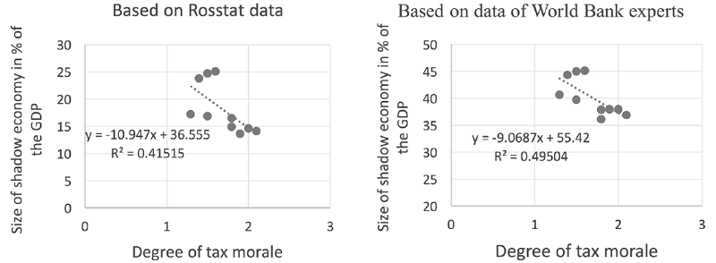 Even a more close link is observed. The dependency reflects a considerably negative correlation (-0,644; -0,703). According to the established dependency, increasing tax morale of 0,5 points on 4-point scale (from 0 to 3) corresponds the reduction of the shadow sector, according to the minimum estimate, about 4 percentage points and a degree of influence (the coefficient of determination) exceeds 40%.