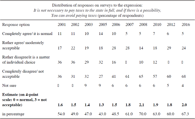 Econometric estimates, represented in the given article for the explanation of tax compliance strategy in Russia, have been carried out similar to this approach based on open data of surveys of the All-Russian Center for the Study of Public Opinion (VCIOM), shadow economy data of Rosstat and experts of the World Bank. VCIOM annual surveys for the years 2001-2016 cover 1600 people from 153 human settlements of 46 members of the Russian Federation (VCIOM). The assessment of tax morale level is made according to 4-point scale (from 0 to 3), where 0 is assigned to the response “this is normal, acceptable”, and 3 - “not acceptable” (Table 1).