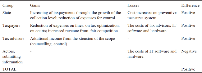 As can be seen, efficiency of the proposed strategy of control is defined by positive influence of project transformations on the state budget (reduction of the transaction costs on control at a lower cost on warning, raising tax compliance level at the account of preventive measures system), and also on taxpayers and tax advisors.