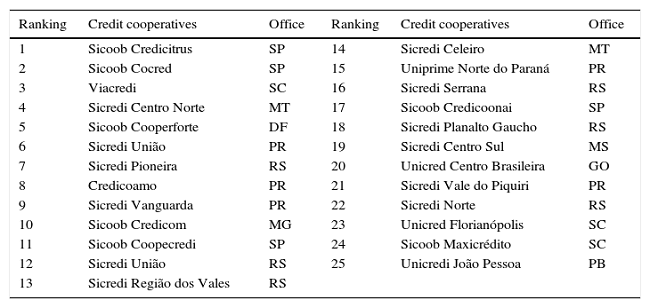 Data from the Central Bank of Brazil (BACEN, 2013) indicate that, in 2013, there were 1,192 credit cooperatives in operation in Brazil. However, the sample used by our research consists of the 25 largest credit cooperatives, in accordance with Central Bank of Brazil's December 2013 data which have provided the data for the period under review. The composition of this sample can be seen in Table 1.