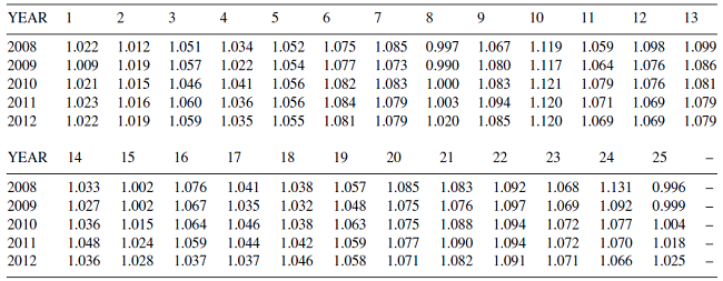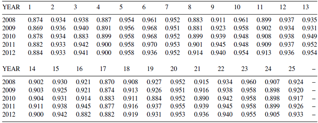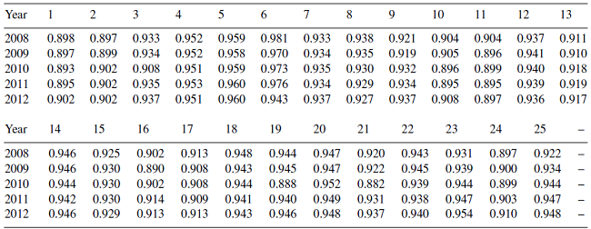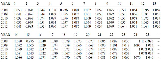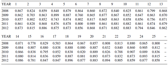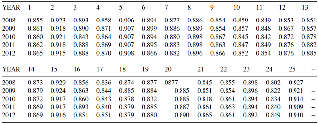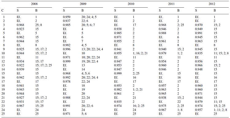 However, it can be seen that all cooperatives have obtained efficiency scores close to 100%. In 2008 and 2012, Uniprime Norte do Paraná stood out. It was considered a 15 times benchmark for other cooperatives in 2008; in 2012, 16 times. In 2010 and 2011, Sicoob Cocred stood out and was a 15 times benchmark for other cooperatives in 2010; 14 times, in 2011. In 2009, Sicredi Norte RS/SC was considered a benchmark for 8 cooperatives.