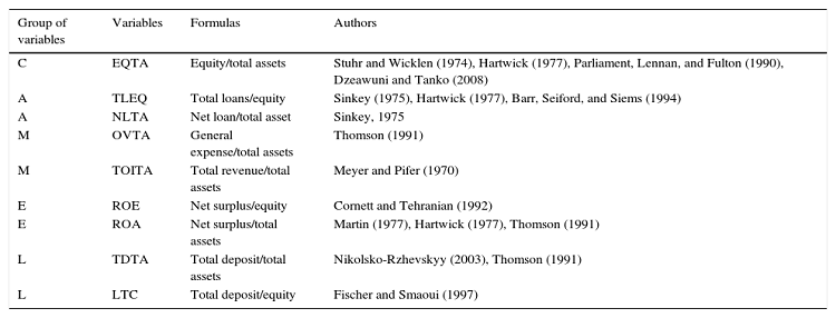 Meyer and Pifer (1970) have proposed a model of eight indicators predicting the banks' bankruptcy. This set of indicators aims at evaluating the performance of banking activities. They are: managers' indebtedness, loan growth, interest rates on deposits, cost growth, actual loans, returns on loans, asset quality, and asset growth. After further adjustments, this model was called CAMEL, with 5 groups of indicators, such as: capital adequacy, asset quality, management capability, returns efficiency, liquidity, and market-risk sensibility.