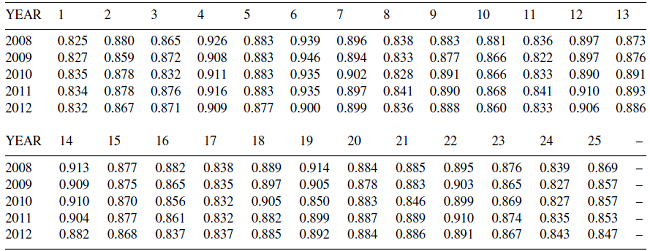Unicred Florianópolis showed higher performance in the years 2008 and 2010. During 2009, 2011 and 2012, the cooperatives Sicoob Maxicredito, Sicredi Pioneira RS and Sicredi Planalto Gaucho RS had higher performance, respectively. Lower performance in the five years were with the following cooperatives: in 2008, Sicoob Credicoonai with an index of 0.583; in 2009, Sicoob Cocred with an index of 0.703; in 2010, Sicredi Centro Norte with an index of 0.743; in 2011, Sicredi União with an index of 0.800; finally, in 2012, Uniprime Norte do Paraná with an index of 0.781.