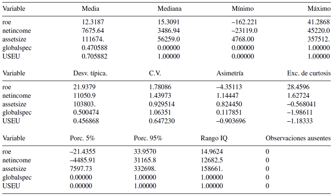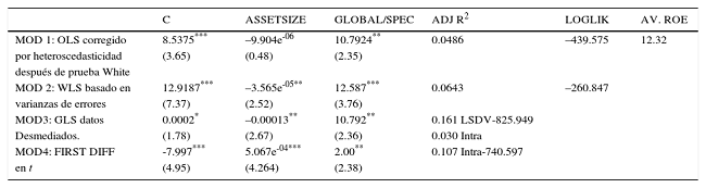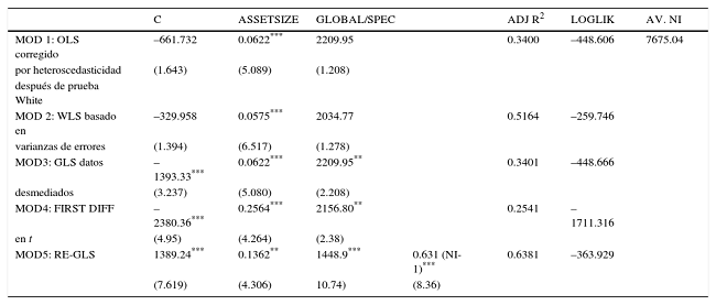 Los modelos en panel deben ajustarse por problemas de eficiencia estadística de posible heteroscedasticidad y correlación seriada de errores de estimación. Asimismo, para estimadores consistentes se estiman modelos con efectos fijos o dummies por tipo de empresa global versus especializada, en estimaciones del panel equilibrado de1) pooled OLS o POLS; 2) WLS basada en varianzas de los errores para consistencia; 3) panel con datos desmediados o Within Panel; 4) panel en primeras diferencias temporales o first diff; y 5) transformaciones GLS de tipo Koyck o random effects GLS o RE-GLS (Cameron y Trivedi, 2005).