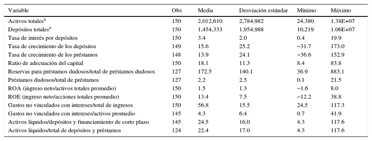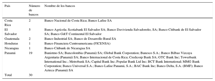 Los datos bancarios empleados en esta investigación provienen de la agencia Bankscope y la información macroeconómica fue obtenida del Banco Mundial (World Development Indicators [WDI]). Actualmente, en los países centroamericanos bajo estudio hay 159 bancos clasificados por Bankscope como comerciales: 19 en Costa Rica, 14 en El Salvador, 24 en Guatemala, 19 en Honduras, 7 en Nicaragua y 76 en Panamá. Sin embargo, muchos de los indicadores clave empleados en esta investigación no están disponibles para muchos de estos bancos y, tras una revisión y eliminación de valores extremos, la muestra aquí empleada incluye 30 bancos. Varios de estos bancos son considerados grandes en sus respectivos países, es decir, tienen un porcentaje alto de participación en los distintos mercados bancarios. Un ranking de los bancos puede verse en Ríos (2012).