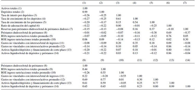 Así pues, se tienen dos indicadores para cada una de las categorías del sistema CAMUL, excepto capitalización. No es de sorprender la alta correlación que se presenta entre cada par (tabla 3); consecuentemente, en el análisis econométrico estas variables son incluidas evitando multicolinealidad, a la vez que permiten verificar la robustez de los resultados a diversos indicadores de los fundamentales bancarios.