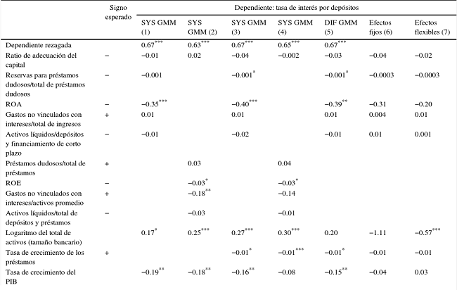 Cuando la variable dependiente es la tasa de interés por los depósitos, las hipótesis estadísticas indican una relación negativa con los fundamentales bancarios. Es decir, se espera una relación negativa con el ratio de adecuación del capital, reservas para préstamos dudosos/total de préstamos dudosos, ROA, ROE, activos líquidos/depósitos y financiamiento de corto plazo, y activos líquidos/total de depósitos y préstamos. Por el contrario, se espera una relación positiva con préstamos dudosos/total de préstamos, gastos no vinculados con intereses/total de ingresos, y gastos no vinculados con intereses/activos promedio.