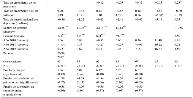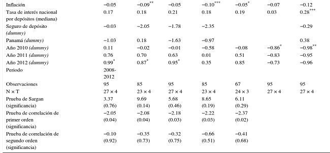 Además, dado que la muestra está dominada por bancos que operan en Panamá, se realizaron los mismos ejercicios econométricos únicamente para estos bancos (no se presenta en tablas para ahorrar espacio). Los resultados obtenidos son cualitativamente los mismos, previsiblemente, porque la variable dicotómica PANAMA no presenta significancia estadística en las regresiones del mecanismo de disciplina basado en precio, y aunque sí presenta significancia estadística en el mecanismo basado en cantidad, no es más que el reflejo del mejor comportamiento macroeconómico panameño.