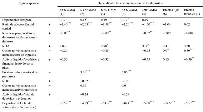 Cuando la variable dependiente es la tasa de crecimiento de los depósitos, las hipótesis estadísticas indican una relación positiva con los fundamentales bancarios. Es decir, se espera una relación positiva con el ratio de adecuación del capital, reservas para préstamos dudosos/total de préstamos dudosos, ROA, ROE, activos líquidos/depósitos y financiamiento de corto plazo, y activos líquidos/total de depósitos y préstamos. Por el contrario, se espera una relación negativa con préstamos dudosos/total de préstamos, gastos no vinculados con intereses/total de ingresos, y gastos no vinculados con intereses/activos promedio.