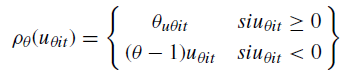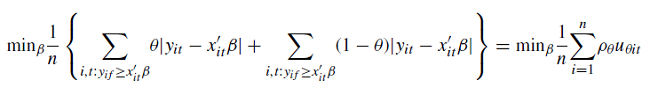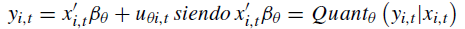 donde yi,t es la variable dependiente, x’i,t el vector de regresores, β es el vector de parámetros a estimar, u es el vector de los residuos y Quandθ (yi,t| xi,t ) representa la condición cuantílica θ de yi,t dado xi,t. Los valores que puede tomar θ están entre 0 y 1, utilizándose la siguiente expresión para su cálculo: