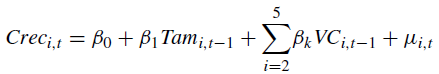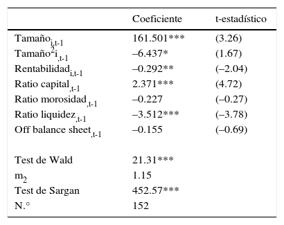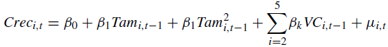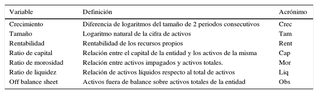 donde Creci,t representa el crecimiento del banco i en el año t, que viene explicado por el tamaño de la entidad en el año anterior representado por Tami,t-1, además de por un conjunto de variables de control que representan la rentabilidad, el nivel de solvencia, el porcentaje del negocio fuera del balance, la tasa de liquidez y la tasa de morosidad. Por último, βk son los parámetros a estimar y μi,t el término de error2.