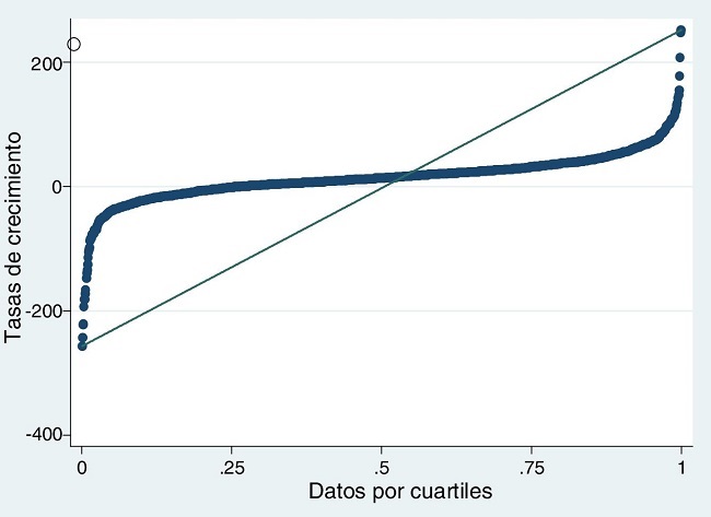 Los estadísticos descriptivos de las variables objeto de estudio se presentan en la tabla 3, tanto para la muestra total como por cuartiles. En relación con los estadísticos descriptivos de la muestra total, es preciso indicar que las entidades en Brasil han crecido de media un 14.30%, situándose el valor del primer cuartil en tasas negativas del 0.99%, la mediana en el 14% y el tercer cuartil en el 32%. Como se puede observar en la figura 1, que representa la distribución de las tasas de crecimiento por cuartiles de las entidades financieras en Brasil, las tasas de crecimiento aumentan por cuartil pero no de manera uniforme, ya que las tasas de crecimiento se distribuyen conforme a una normal, como se muestra en el apartado siguiente.