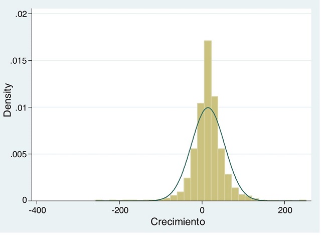 Sin embargo, según Leitão, Nunes y Serrasqueiro (2010), con el uso exclusivo de esos métodos, no es posible contrastar la ley de Gibrat basándose en la distribución del crecimiento de las empresas, ya que para ello lo adecuado es el uso de la metodología de regresión cuartílica, tomando como referencia la distribución del crecimiento del conjunto de empresas de la muestra. De este modo, en la figura 2 se observa la aproximación de la distribución de las tasas de crecimiento de la banca en Brasil a una distribución normal. En dicha figura se observa que existe un mayor número de entidades con tasas positivas de crecimiento, situándose la mayoría en los valores centrales próximos al 14% de crecimiento.