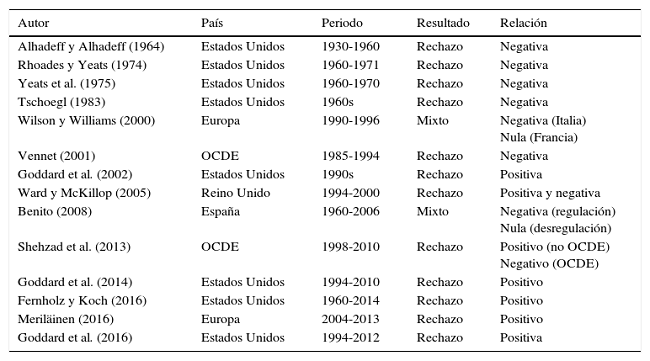En la tabla 1 se presenta una revisión de trabajos que analizan el crecimiento bancario mediante el contraste de ley de Gibrat. Como podemos ver, estos estudios se centran en el análisis de la banca de Estados Unidos y Europa, presentando resultados no concluyentes. En los primeros estudios se observa una relación negativa entre crecimiento y tamaño bancario, lo que implica que las entidades más pequeñas son las que más crecen (Alhadeff y Alhadeff, 1964; Rhoades y Yeats, 1974; Yeats et al., 1975; Tschoegl, 1983; Wilson y Williams, 2000; Vennet, 2001). Por el contrario, los trabajos más recientes encuentran evidencia de una influencia positiva del tamaño sobre el crecimiento, siendo las entidades de mayor tamaño las que más crecen (Goddard et al., 2002; Shehzad et al., 2013; Goddard et al., 2014; Fernholz y Koch, 2016; Merilainen, 2016; Goddard, McKillop y Wilson, 2016).