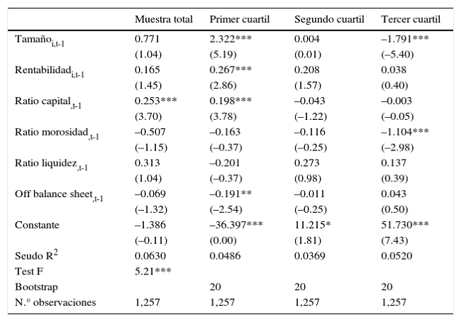 En cuanto a la influencia del resto de las variables, los resultados obtenidos nos muestran que la rentabilidad ejerce una influencia positiva sobre el crecimiento pero, solo es significativa en el primer cuartil. La ratio de capital también ejerce una influencia positiva sobre el crecimiento, siendo significativa en el primer cuartil y el conjunto de la muestra. Por otro lado, la morosidad ejerce una influencia negativa y significativa en el tercer cuartil y la ratio OBS sobre el primer cuartil. Los resultados obtenidos de los test de buena especificación nos muestran que las variables son significativas conjuntamente.