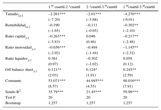 En cuanto al resto de las variables, se observa que las principales diferencias intercuartílicas se producen entre el tercer y primer cuartil, siendo las diferencias significativas para las variables de rentabilidad, ratio de capital, morosidad y OBS. No obstante, el primer cuartil muestra diferencias significativas con el segundo cuartil también en la influencia de la ratio de capital y de morosidad.