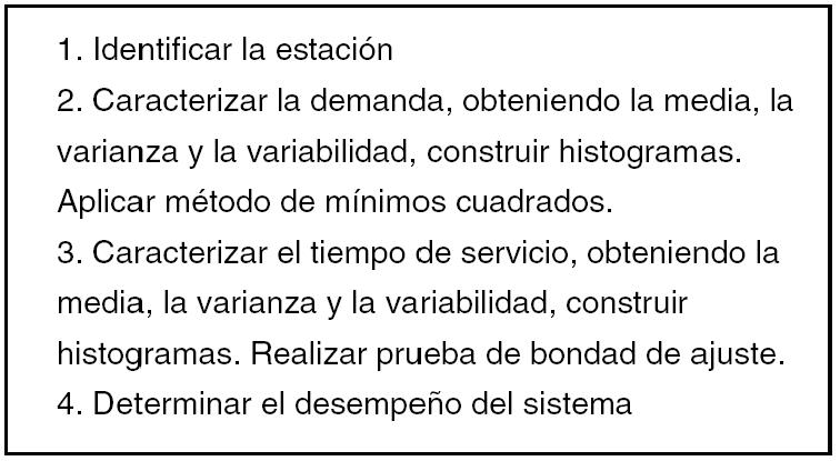 El estudio se llevó a cabo siguiendo los pasos de lafigura 2. Para analizar una línea de espera se debe caracterizar la demanda y los tiempos de servicio; una vez obtenida esta información, se continúa con el cálculo de las propiedades. El método de mínimos cuadrados se utilizó para verificar la función que ajusta mejor los datos de los arribos y los servicios. Esto es importante, porque en teoría de líneas de espera varios modelos analíticos suponen que el proceso sigue un tipo de distribución y las funciones relacionadas (Hall, 1991). En caso de omitirla, entonces los resultados analíticos deben tomarse con reserva y se recomienda validarlos de alguna otra manera (simulación, por ejemplo).