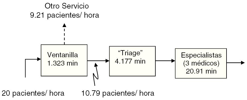 Desde un enfoque de sistemas, el área de Urgencias se encuentra sobrepasada por la demanda de servicio, ya que los pacientes provenientes deltriagese acumulan sin límite. Es necesario adicionar un médico en el área de especialistas para favorecer el flujo de pacientes, aunque seguirá siendo el cuello de botella del área de Urgencias.