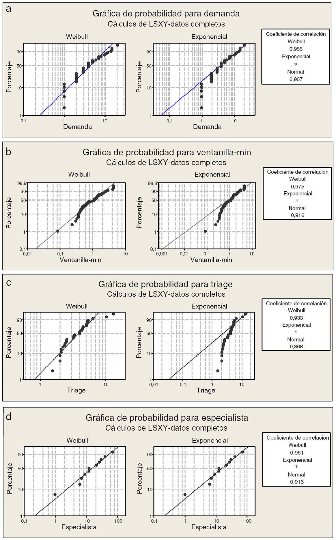 El método de mínimos cuadrados realizado con el paquete Minitab 16 da como resultado que la función Weibull ajusta adecuadamente la demanda y los tiempos de servicio (fig. 4). Se decidió para el análisis aplicar los modelos analíticos correspondientes a cada etapa por separado y al final unir toda la información: eltriagees un sistema exponencial concservidores y disciplina primero-en-entrar-primero-en-salir, y los especialistas corresponden a un sistema exponencial concservidores ykniveles de prioridad en la atención (tabla 3) (Taylor y Karlin, 1998;Hillier y Lieberman, 2005;Curry y Feldman, 2009). La decisión de utilizar la distribución exponencial basada en una Weibull con parámetro de forma cercano a 1 se vio validada por la bondad de ajuste y por la simulación.