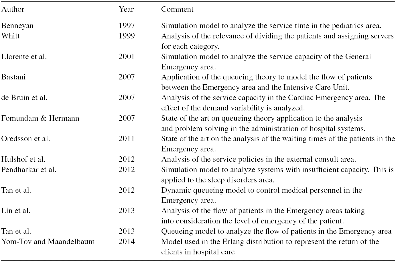 Hulshof et al. (2012)proponen estrategias para mejorar el flujo de pacientes de consulta externa clasificándolos por los síntomas del paciente y asignándoles sus respectivos médicos (servidores). El modelo analítico se construye tomando como base los cambios en la operación de varios hospitales de Alemania. La misma estrategia de clasificar pacientes y asignarlos a médicos se propone enTan, Tan y Lau (2013)yTan, Lau y Lee (2013), donde además se desarrolla un modelo dinámico para analizar el área de urgencias de un hospital en Singapur. El modelo trabaja en tiempo real y se requieren métodos heurísticos para obtener una solución del mismo.